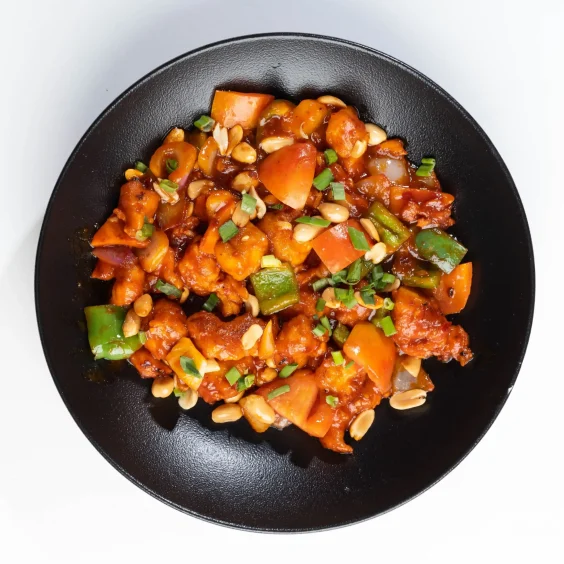A mild stir-fried chicken dish with nuts, peppers, and gentle heat.